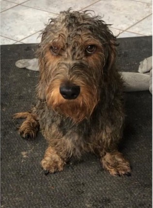 zeigt sich hier in aller Schönheit nach seinem Besuch in einem "Herren / Hundesalon"