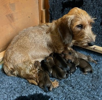 Am 27.11. hat sie tatsächlich mit 9 Welpen einen außergewöhlich großen Wurf in ihrer neuen , ostfriesischen Heimat gesund zur Welt gebracht. Dabei sind ganz offensichtlich fünf rote und vier saufarbene Welpen.