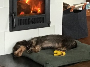 geniesst bei diesem norddeutschen "Schweinewetter" , dank ihrer Familie Richter, die Wärme vor dem hauseigenen Kamin. Ist eben doch wesentlich angenehmer!