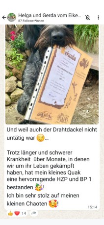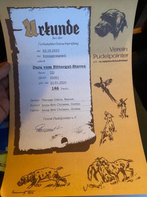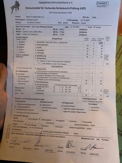 hat am 06.04.2025 ihre erste Prüfung VJP der "Deutsch Drahthaar" mit Bravour bestanden und apportiert hier mit Stolz und gekonnt ihrem Frauchen Anna-Brit die entsprechenden Urkunden