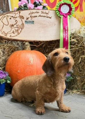 Sie hat auf der Zuchtschau ein "vorzüglich" erhalten und ist zum schönsten Teckel der Gruppe gekürt worden!